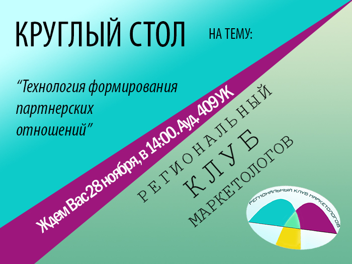 Приглашаем всех небезразличных к проблемам маркетинга на наше первое в новом сезоне заседание, которое пройдет в формате круглого стола на тему «Технология формирования партнерских отношений». Время проведения – 28 ноября 2013 года, 14:00. Место – аудитория 409 УК.