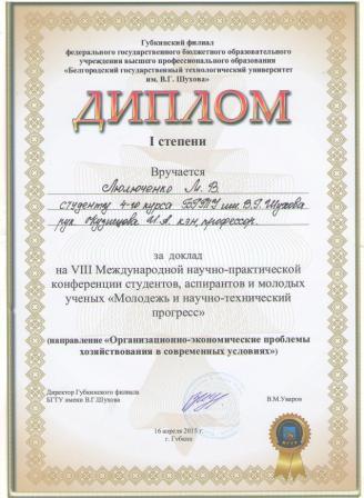 Отличным подарком к предстоящему празднику Великой Победы от студентов-выпускников кафедры Экономики и организации производства стала очередная научная победа бакалавра 4 курса Михаила Люлюченко, занявшего Iместо на проходившей 16 апреля 2015 года в г. Губкине VII Международной научно-практической конференции студентов, аспирантов и молодых ученых «Молодежь и научно-технический прогресс». Доклад «Проблемы развития молодежного предпринимательства в России» (научный руководитель к.э.н., профессор Кузнецова И.А.), был признан лучшим по направлению «Организационно-экономические проблемы хозяйствования в современных условиях». Кроме этого, Михаил был отмечен в специальной номинации «Глубина исследования».