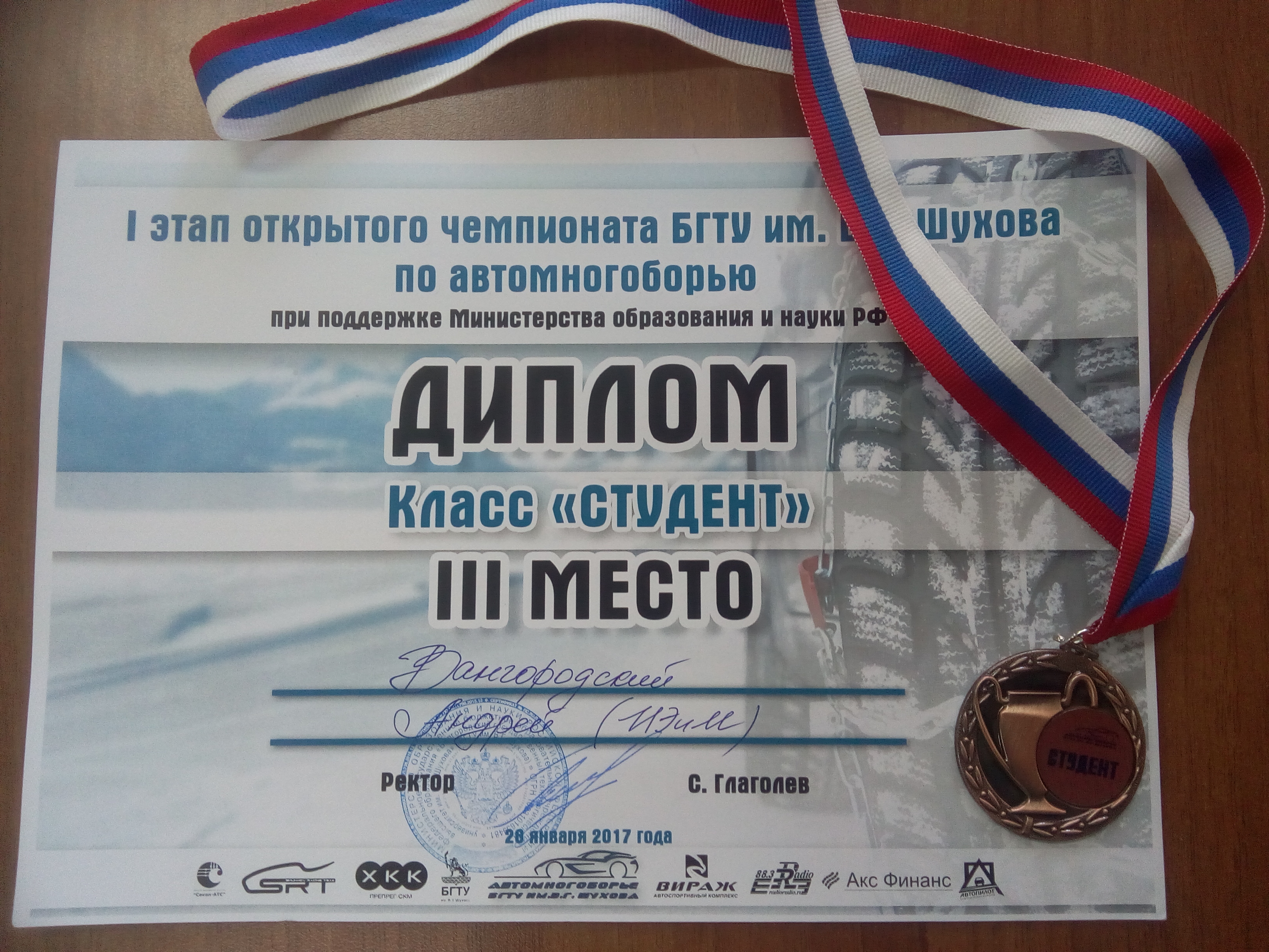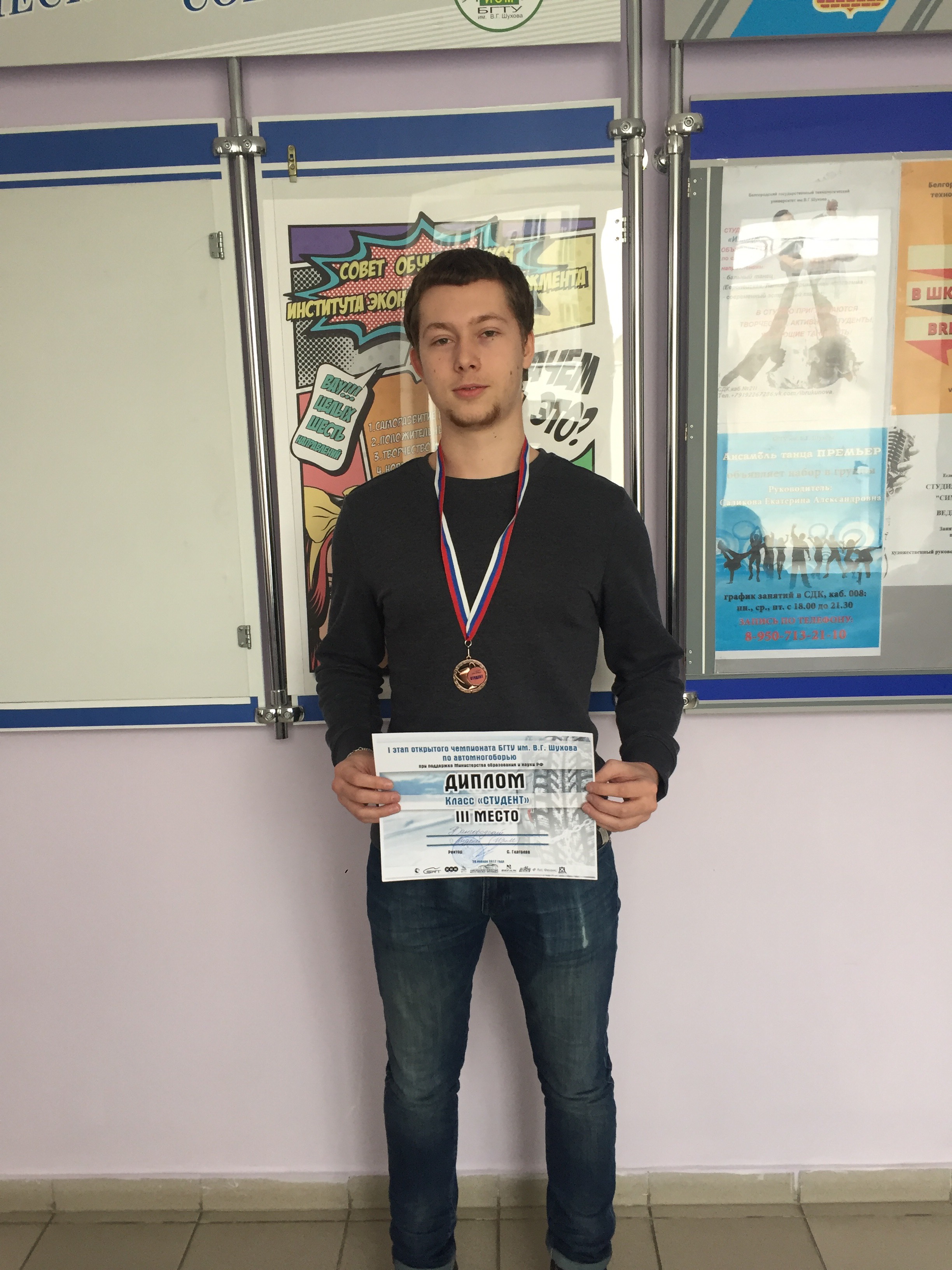 Поздравляем студента института экономики и менеджмента Вангородского Андрея, занявшего призовое III место на I этапе Открытого чемпионата БГТУ им. В.Г. Шухова по автомногоборью при поддержке Министерства образования и науки РФ.