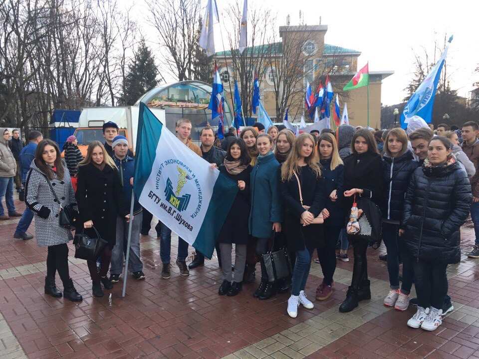 18 марта в областном центре возле парка Победы состоялся городской праздник, посвященный третьей годовщине присоединения Крыма к России, в котором приняла участие наиболее активная молодёжь Белгорода. Значительную долю активистов составили обучающиеся в БГТУ им. В.Г. Шухова и в том числе студенты института экономики и менеджмента.