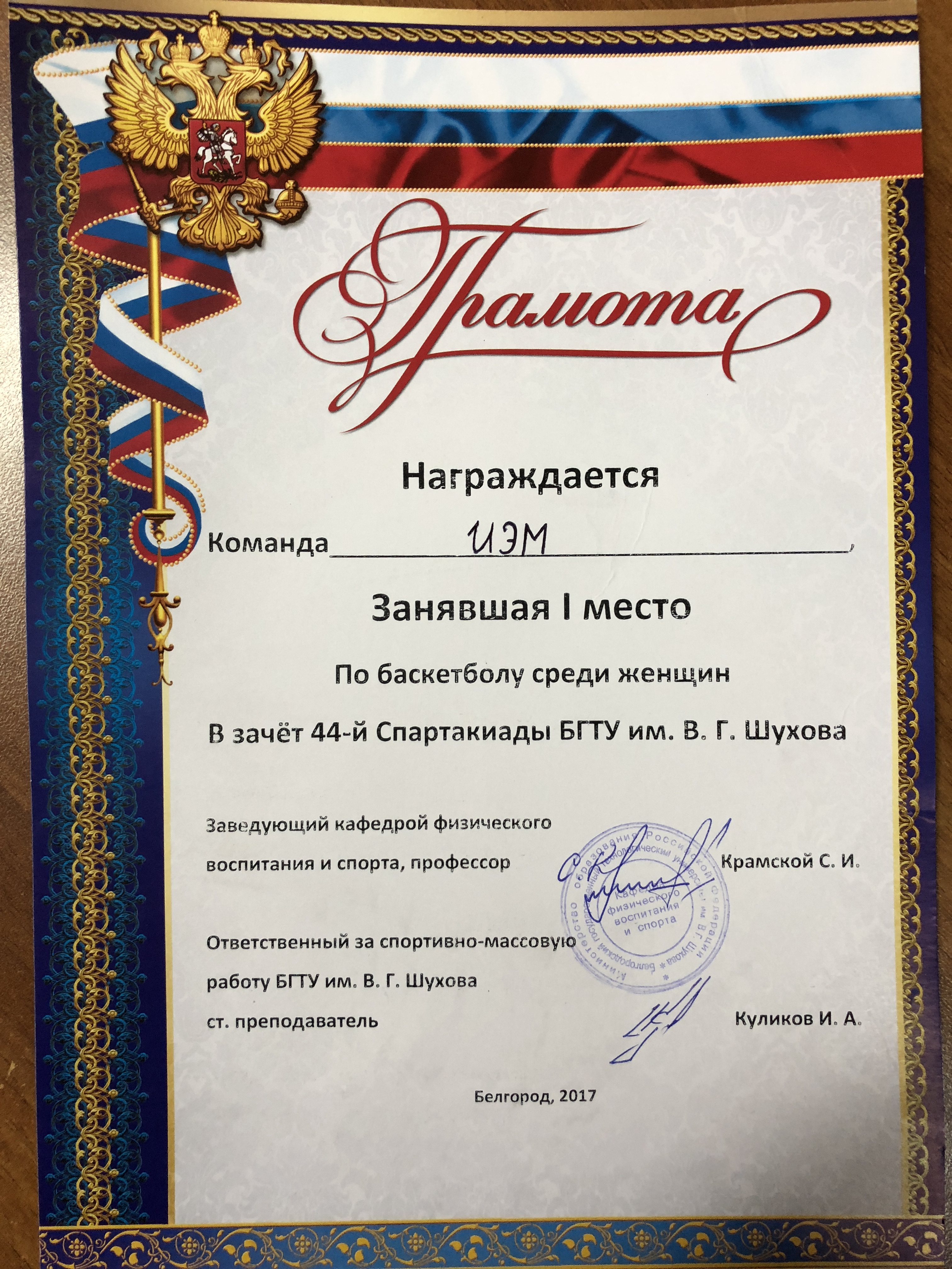 С начала 2017 года стартовала 44-я Спартакиада Белгородского государственного технологического университета им. В.Г. Шухова, в которой женской команде института экономики и менеджмента по баскетболу вновь удалось завоевать I место! Сердечно поздравляем наших спортсменок и желаем дальнейших побед!