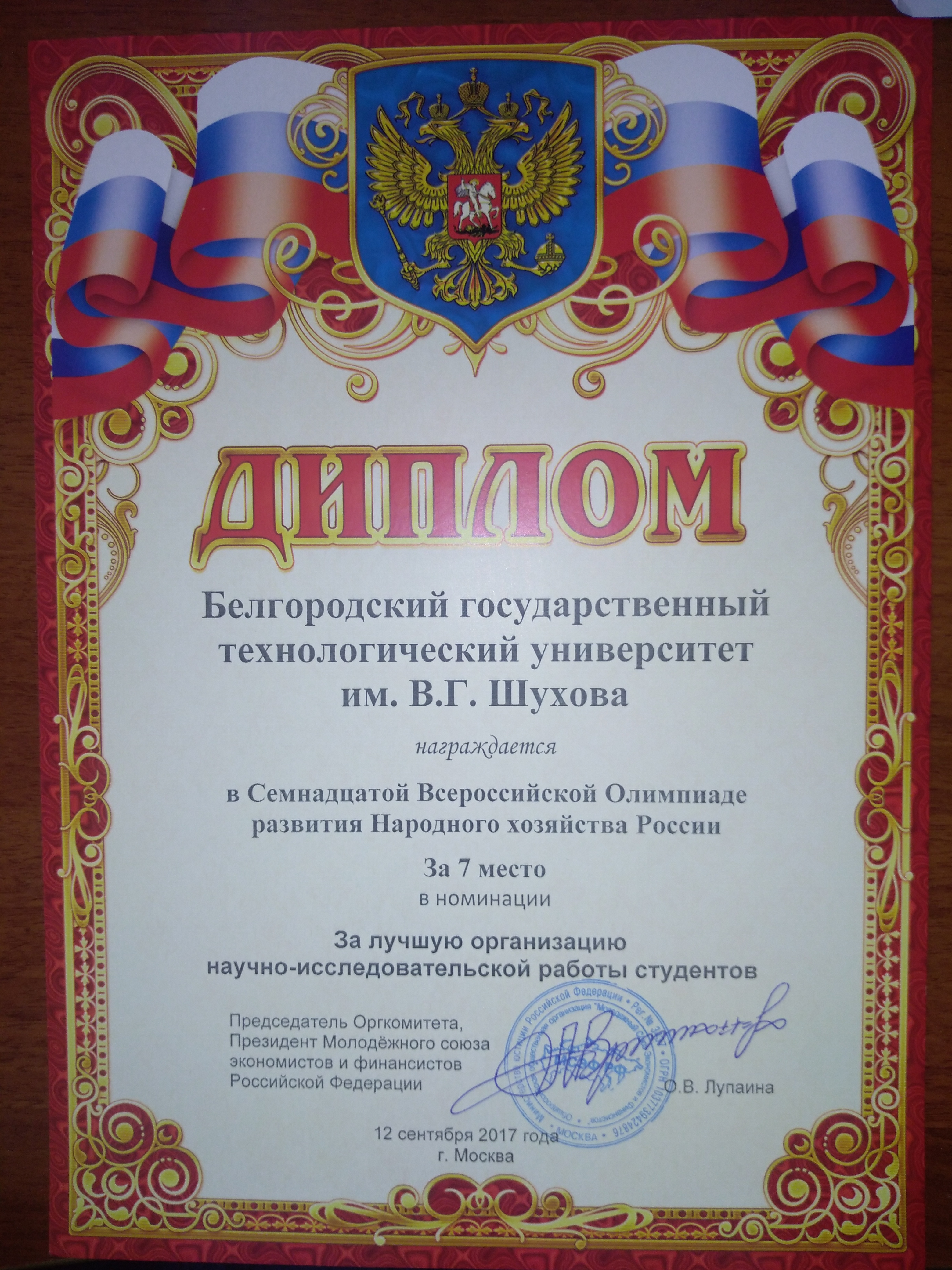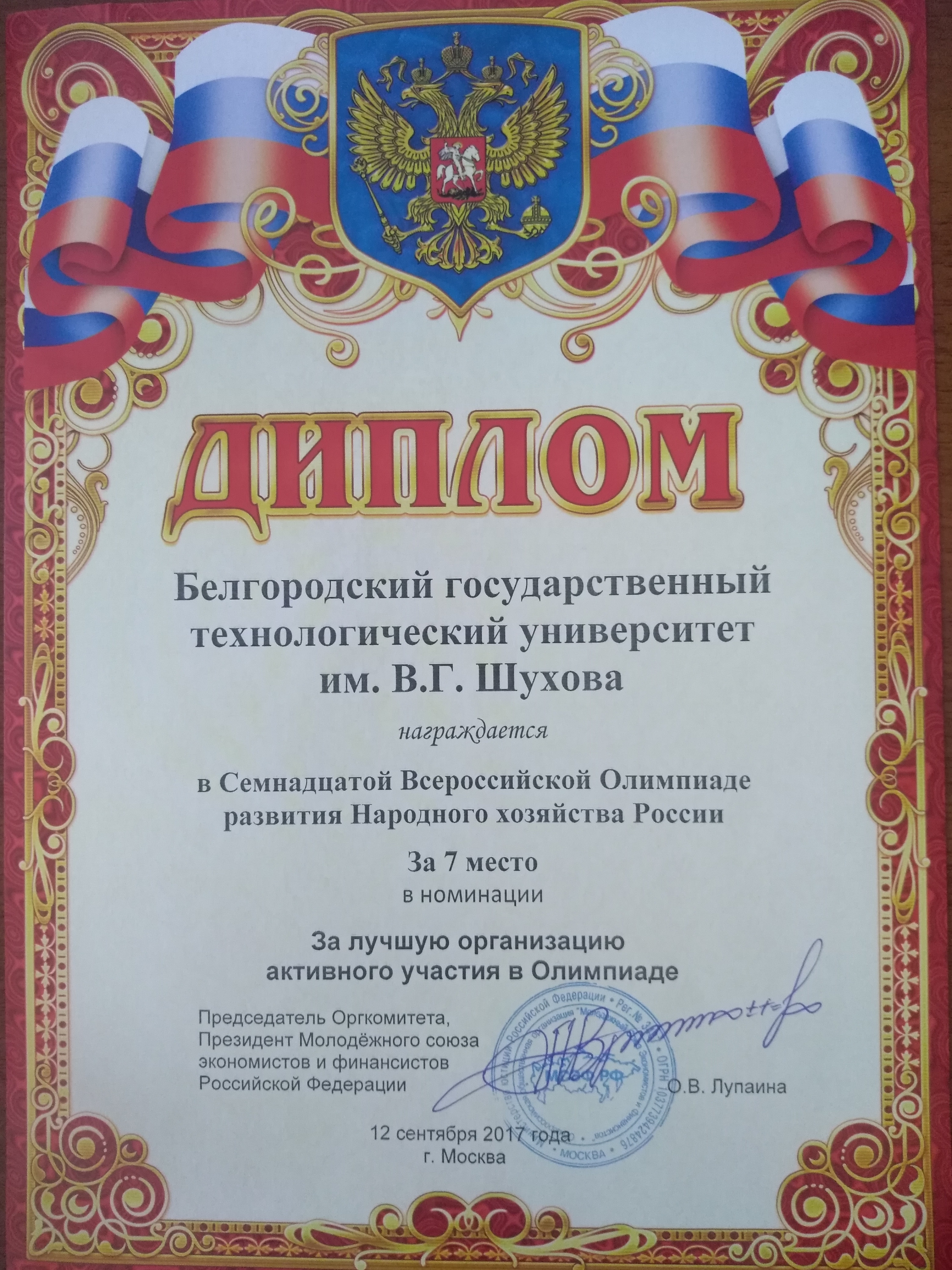 Молодёжный союз экономистов и финансистов Российской Федерации выражает БГТУ им. В.Г.Шухова свою признательность за большую работу, проводимую в области подготовки молодых специалистов в интересах развития Народного хозяйства России, за активное участие учащихся ВУЗа в рамках Семнадцатой Всероссийской Олимпиады развития Народного хозяйства России.