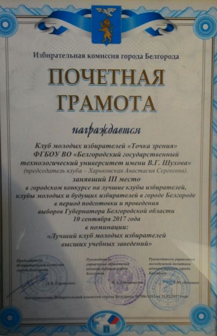 Клуб молодых избирателей "Точка зрения" ФГБОУ ВО "Белгородский государственный технологический университет им. В.Г. Шухова" (председатель клуба - студентка группы ЭБ-43 Института экономики и менеджмента Харьковская Анастасия Сергеевна) занял почетное III место в номинации "Лучший клуб молодых избирателей высших учебных заведений".